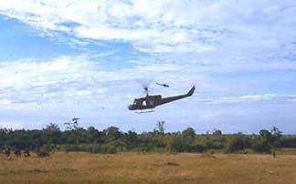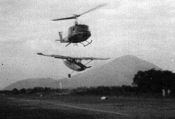 | Alan Laya, CH-21 pilot and HU-1 pilot during the change over remembers: "The HU-1's finally began to arrive but not before we were involved in one more combat assault north of Phan Thiet. With B-26's, T-28's and Armed Huey's(UTT), the mission was a success. The landing zone was beyond belief; an area large enough for a single ship, but rough enough to never want to see it again. We had four LZ's and flew in flights of four so each approached his respective LZ at the same time. I had to drop the aircraft over a tree line then try and bring it to a hover because of the mounds and tree stumps. With ten troops on board, I couldn't salvage the landing and had to bring it to the ground. Fortunately, we hit solid ground with no forward roll, but on the next lift into the area, we were not as fortunate. I landed on a mound knocking the big beast(H-21) to one side. She started to tip on the left side but we did have enough power to straighten her and bounce her in again this time level. In leaving the area the trees in front of us presented quite an obstacle. I can still feel that front wheel clipping the tree tops as we pumped the collective trying to retain power to get airspeed and then altitude. Another day, another combat assault, a few more gray hairs and another trying day for the nervous system. That day will always be memorable because it was the last time I flew an H-21! We had our HU-1's waiting for us in Saigon." |