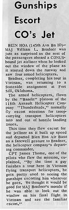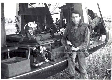 "I didn't like Duc Hoa for lunch because we always parked close to the artillery and of course they would always get a fire mission while we were there. Those 105s cracked so sharp that even with the flight helmets on, it hurt the ears. I was flying as Crew Chief in "The Fabulous Blue 7" with Thunderbird 29er, Lyman Sramek, as AC, a Peter Pilot( I don't remember his name), and Gunner, SP4 George Gomez. We had been flying trail and were responsible to monitor guard frequency in case there was some kind of emergency while we were on the ground." "After we had time to complete lunch, a couple of the guns took off to go cover the ARVNs. Not too long later, while hiding from the hot sun on the shady side of the chopper, we got the word to scramble. After take-off we learned that a Bandit was down and we were to recover the crew. They were saying the Bandit got shot down and we gotta go pick them up. The other gun team was right behind us. Adrenaline and butterflies were going wild inside!" "Just a few minutes out of Duc Hoa we located the crash site and the other guns were reconing the area by fire. On the guns and ready for what is sure to come, we head in. The crash site is freshly burned rice paddies with brush and small trees to one side and pretty well open on the other. The closer we get, Bandit 3 clearly is just a bunch of bent up scrap metal scattered around." |