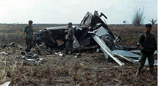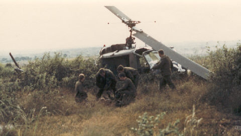 At first we didn't see anyone and feared the worst for the crew. Gomez and I jumped off and went in search for them. The Peter Pilot we found first sitting on the ground some distance from the wreckage. He is all cut up on the face and head and somewhat wobbly and woozy, but we walk him to the slick. Then out again. Finally, we spot the Crew Chief in the tall grass. He is not so good. His left leg has about 5 or 6 knees. As carefully as we can, we quickly carry him to Blue 7 and lay him inside on the floor(I find out later his pelvis is broken, also.) We looked up, ready to head out to look for others and what? Here is the gunner sitting in the chopper. Other than black ash all over him and a half inch cut on the forehead, he seems OK! George was having a tough time handling the broken bodies and I'm not doing too well myself. He stays to help the three injured on Blue 7 while I head out again to look for the missing man, the Aircraft Commander, CWO Carl Martin Creal. The damage is incredible! The tail boom was separated and laying to one side. The engine had been torn away and was laying out in the field. The fuselage was standing straight up. Everything was black with soot. As I went back and was looking around, I couldn't understand where WO Carl Creal could be. Then I went back to the fuselage and looked up at it. The top of the cockpit was gone, but then I saw him, still strapped in the seat and hanging nearly upside down with no helmet on. I just about lost it. There seemed to be no major injury other than a large deep wound in his head over his left eye. After I had assured myself that he was in fact dead, I left and hurried back to the waiting chopper. The others really needed to get to Saigon and medical attention. When I was plugged back in to the intercom, WO Lyman Sramek asked where CWO Creal was. I just said he was dead and the crash site was secure. We high tailed it to the hospital in Saigon. |