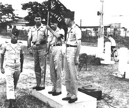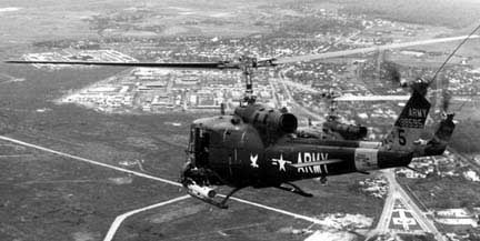 | Wayne Wright, a 63-64 "Thunderbird" remembers: " We received either 24 or 25 brand new UH-1B's to replace the CH-21's. All the aircraft were in tail number sequence. I believe the last tail number was 22063 or 22064 with the last one being the maintenance ship. The first 8 were 1st PLT, with red tails, second 8 were 2nd PLT, with blue tails and the last 8 were 3rd PLT Bandits, with yellow tails. Seems to me the last one (maintenance) had three narrow stripes of all three colors. Don't remember exactly when we got the UH-1B's but it must have been October 1963. We were transitioned by a training team right at Bien Hoa Air Base and my flight records show I began transition training into the "Huey" on Sep 18, 1963. " |