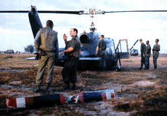 Reed tells the story like this......"We landed at Dong Tam, and I was trail. We shut down and started for the briefing when I noticed that my aircraft was slowly being reclaimed by Mother earth!. The crew and I began cutting and throwing branches under the aircraft to keep it from settling to the belly. Since the major portion of the weight is over the rear of the skids the tail began to droop and was very close to the sand. So, we found a pallet to put under the stinger to keep the tail rotor from settling all the way to the sand."