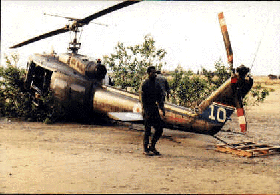 Reed Kimzey tells the story that goes with the above picture...."It was a rather routine resupply pick-up at the 25th DIV base camp at Cu Chi. This bird was number two in the flight (don't know how many were in the flight). The lead aircraft was a little hot and did a BIG deceleration at the end and the pilot of the bird shown (I honestly don't remember his name) stuck the tail rotor in the ground and knocked it and the gearbox off. When the bird started to spin, the pilot bottomed the collective and permanently "smiled" the skids. No one was hurt (except pride). The Bird did a full 180 degree spin before it hit the ground. I think that is my bird in the background."